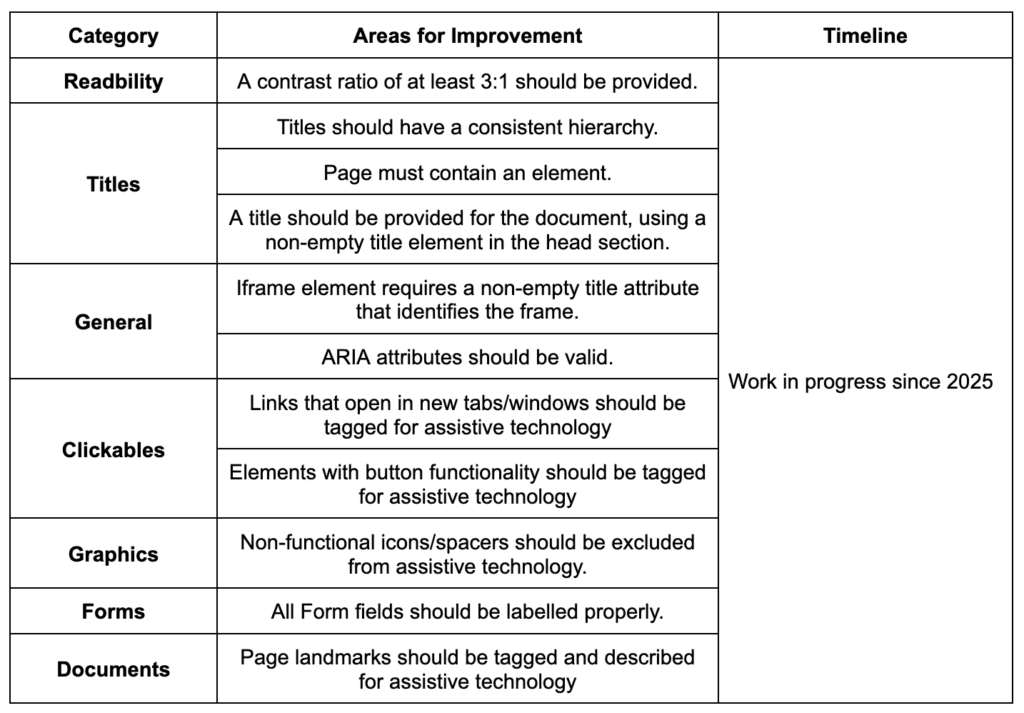 Our team is actively exploring sustainable solutions to address these limitations and improve overall accessibility. If you have feedback or notice any accessibility issues not listed here, please refer to the Feedback and Contact Information section below.